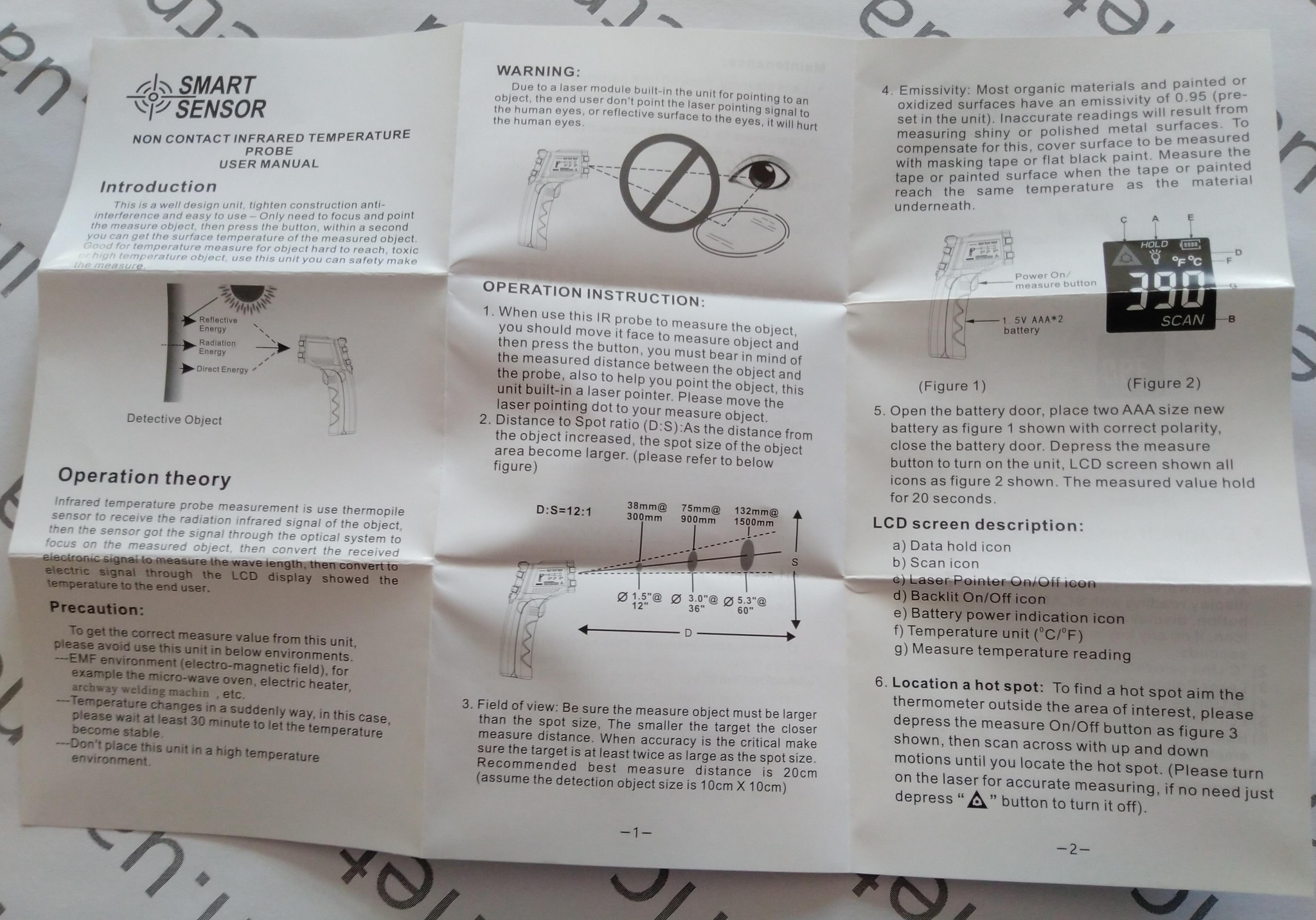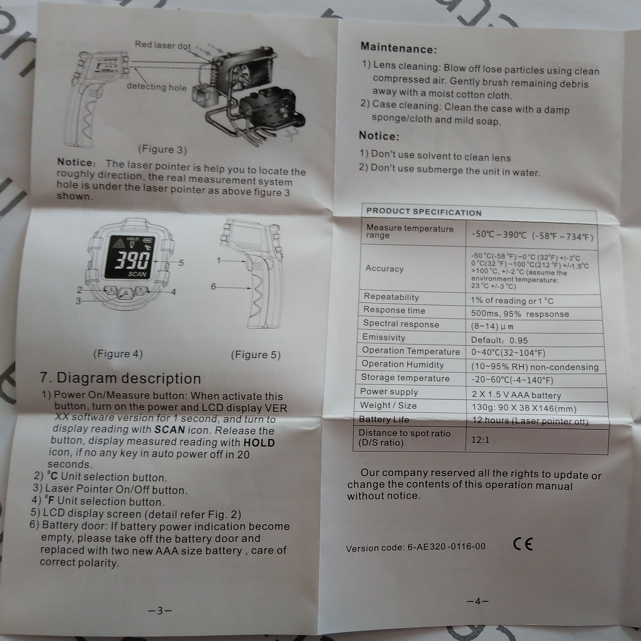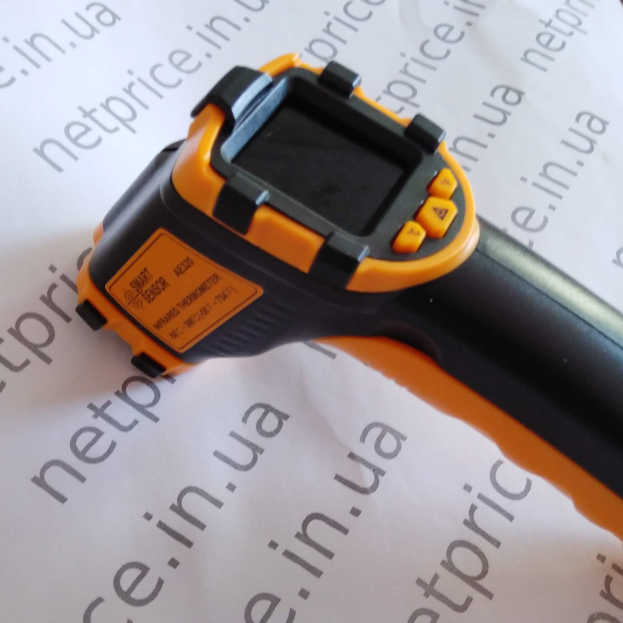 Інфрачервоний пірометр Smart Sensor AE320 з лазерною указкою призначений для вимірювання температури поверхні твердих предметів. Ця модель є найпростішою за функціоналом. Доступне вимірювання температури від -50°C до +390°C (від -58°F до 734°F). Для спрощення націлювання наявна точкова лазерна указка. Кольоровий рідкокристалічний дисплей виводить наступні дані: температура, одиниці вимірювання, заряд елементів живлення, увімкнення лазерної указки.