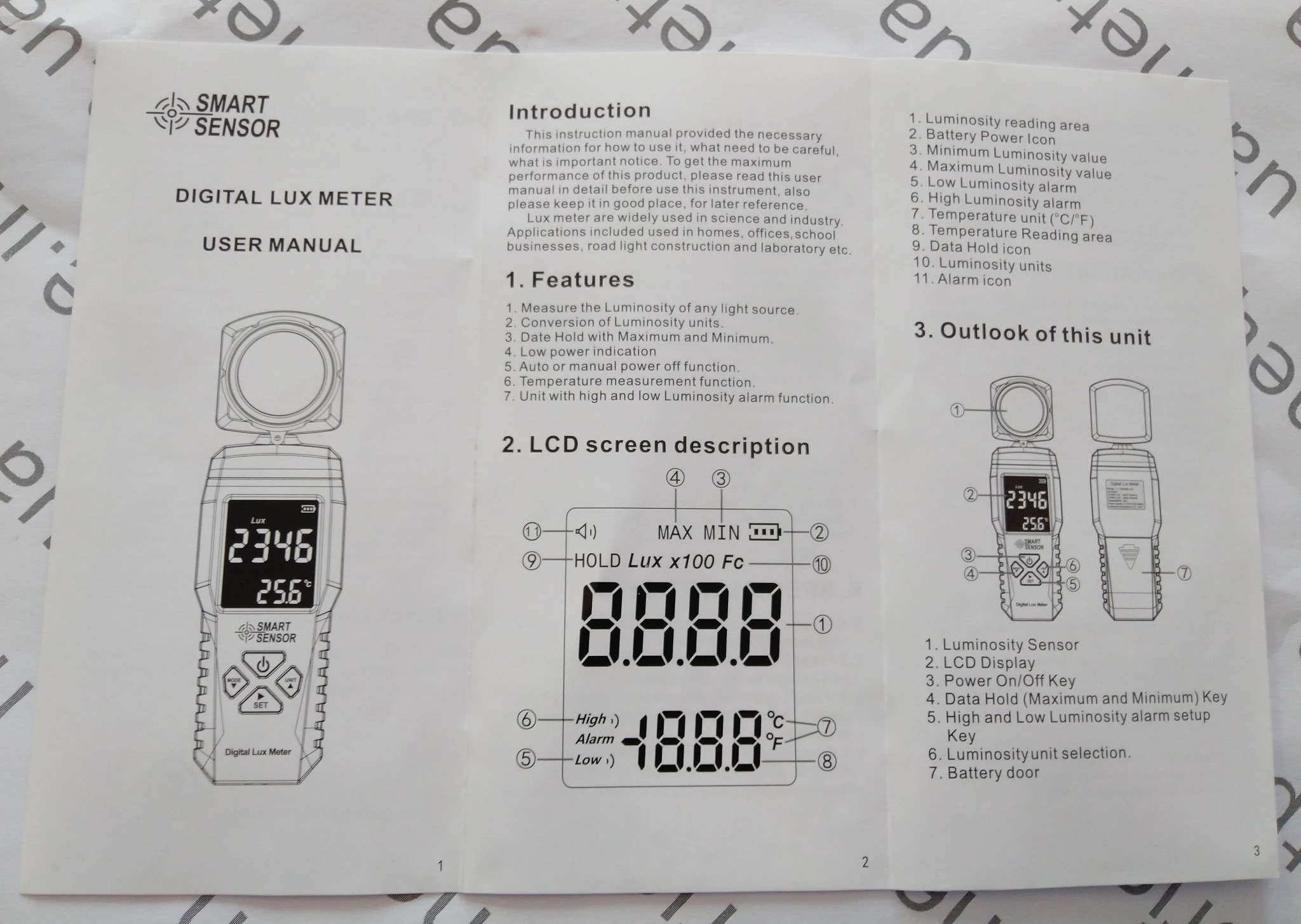 Цифровий люксметр термометр Smart Sensor ST9620 призначений для вимірювання рівня освітленості поверхонь та температури оточуючої середи.
