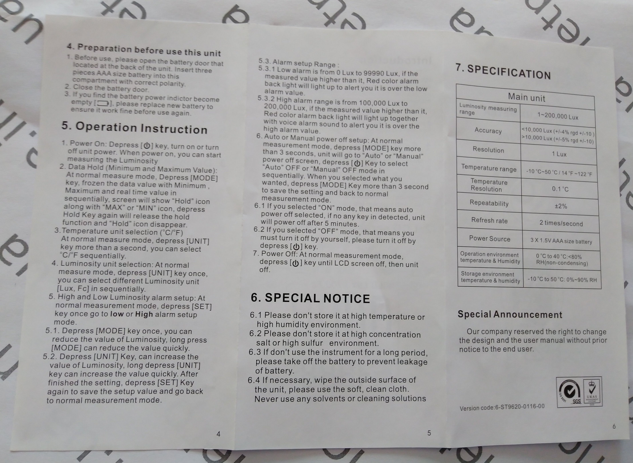 - вимірювання освітленості в трьох режимах: фіксації максимального, мінімального та відображення поточного рівня в діапазоні 1-200000 Люкс