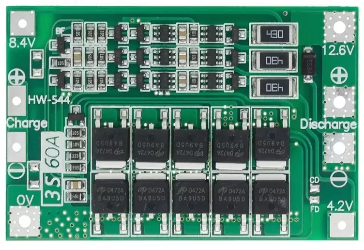 Плата BMS Li-ion 3S 12.6V 60A (HW-544) застосовується для захисту та балансування збірок літій-іонних акумуляторів.