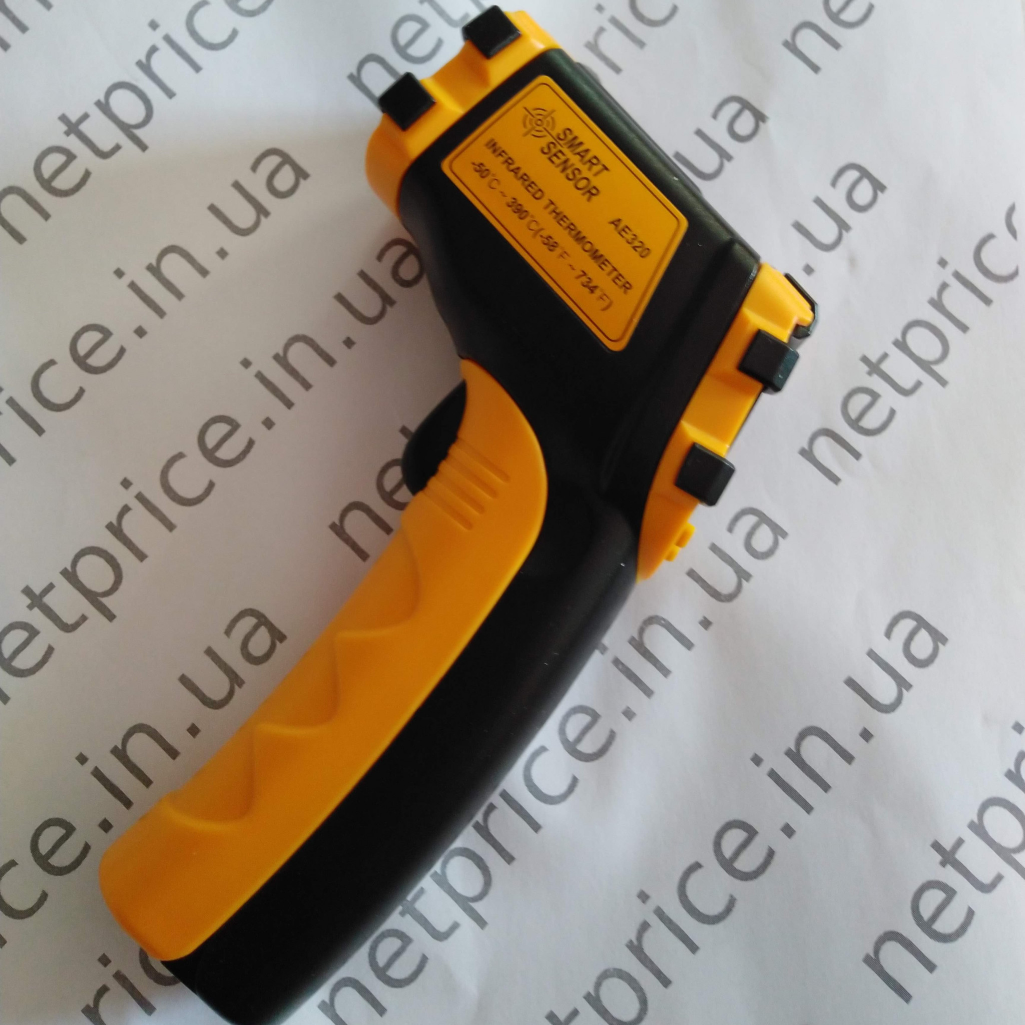 Інфрачервоний пірометр Smart Sensor AE320 з лазерною указкою призначений для вимірювання температури поверхні твердих предметів. Ця модель є найпростішою за функціоналом. Доступне вимірювання температури від -50°C до +390°C (від -58°F до 734°F). Для спрощення націлювання наявна точкова лазерна указка. Кольоровий рідкокристалічний дисплей виводить наступні дані: температура, одиниці вимірювання, заряд елементів живлення, увімкнення лазерної указки.