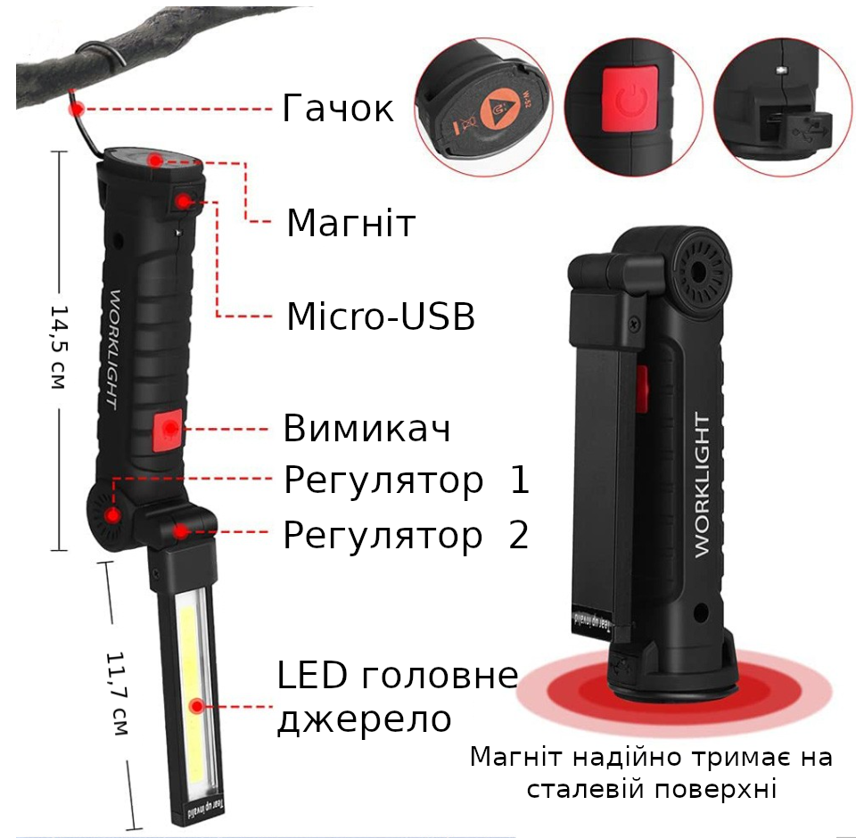 Ліхтарик з магнітом та акумулятором LED COB